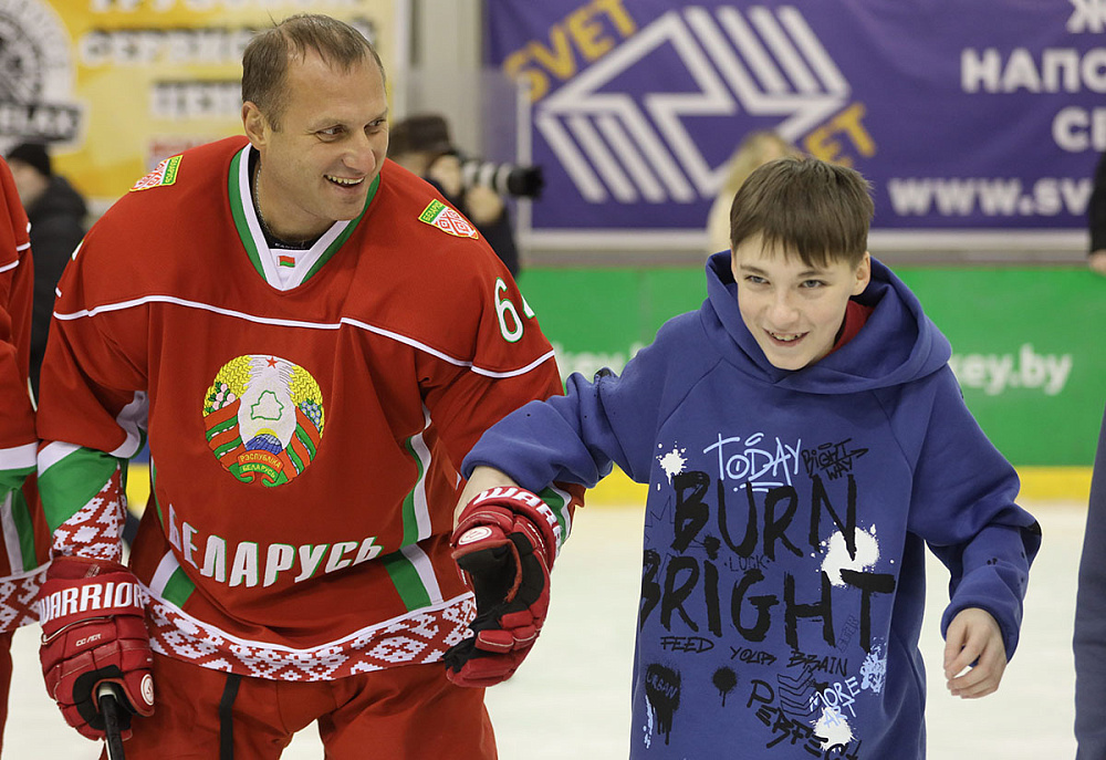 Сначала ребят команда Президента встречала на ледовой арене дворца спорта, где ребята учились кататься на коньках. Узнав, что дети любят кататься на коньках, хоккеисты решили устроить для детей настоящий праздник на льду. Первое знакомство прошло в раздевалке, куда команда приехала с подарками - новенькими коньками. Кто-то из детей хорошо и уверенно стоял на коньках, а кто-то делал свои первые шаги на льду. Ребята осваивали змейку на льду, учились держать клюшку и бросать по воротам. К концу мастер-класса уже все дети уверенно катались и даже захотели стать фигуристами и хоккеистами.