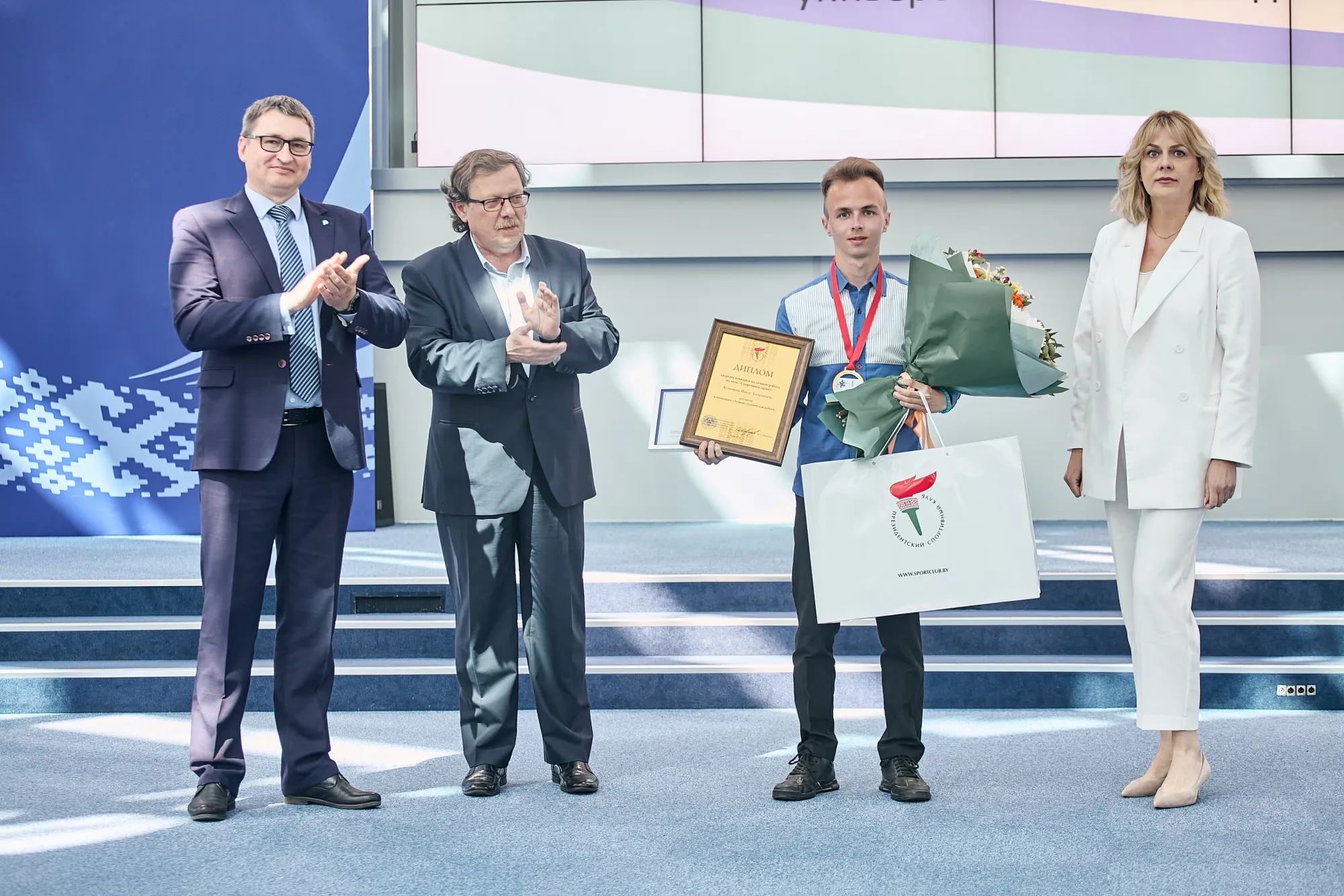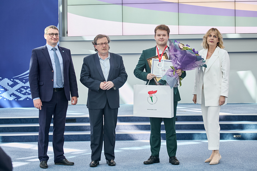 От имени республиканского государственно-общественного объединения «Президентский спортивный клуб» дипломы и ценные призы (ноутбук, смартфон) победителям и лауреатам конкурса в номинации «Лучшая студенческая работа» вручили Наталья Павловна Гурьянчик и Виктор Федорович Деревцов.