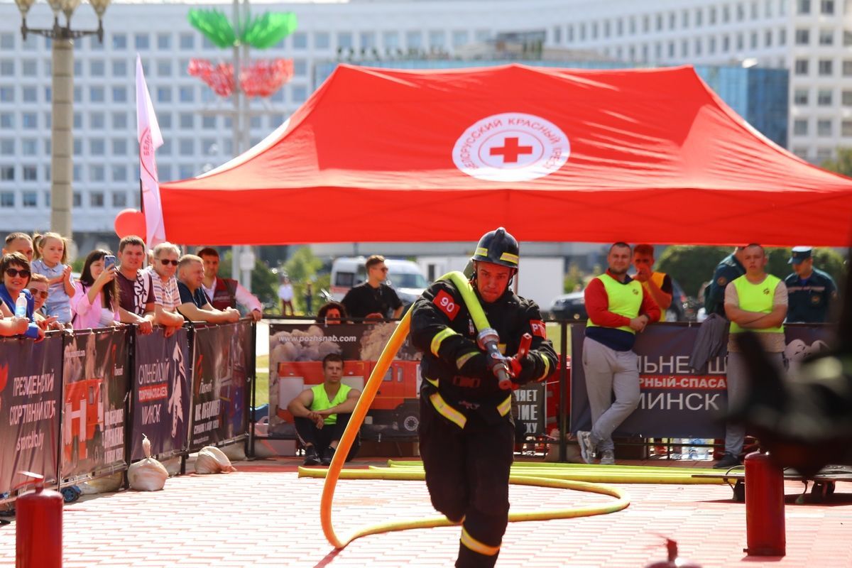 Напомним, «Сильнейший пожарный-спасатель» представляет собой комплекс комбинированных силовых и скоростных нагрузок, которые нужно выполнить за минимальное время в полном снаряжении пожарного-спасателя. Весит такой комплект около 30 кг. На пути к финишу участникам предстоит подняться с рукавной линией на площадку четвертого этажа специальной башни, с нее при помощи силы рук поднять рукавный скаток весом в 19 кг, кувалдой переместить железную 72-килограммовую балку, затем пробежать с пожарным рукавом, заполненным водой, и направить струю воды в мишень, а в завершение перетащить манекен весом около 80 кг. Данные соревнования традиционно проходят в День города Минска с 2016 года.